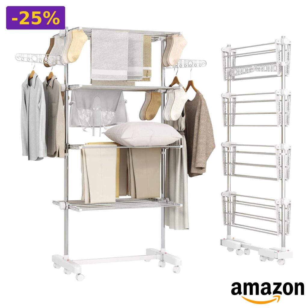 💎 Quattro ripiani e due bracci, 4 ripiani regolabili in altezza, ampio spazio per asciugare diversi capi, bracci laterali per grucce e piccoli oggetti;