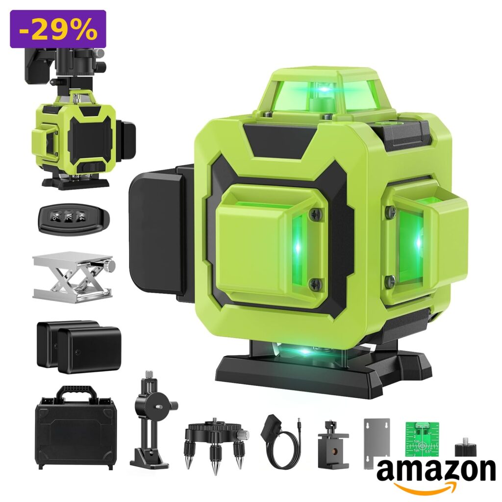💎 Contenuto della confezione, livella laser, batterie, telecomando, custodia, supporti vari, adattatore, caricabatterie, manuale.