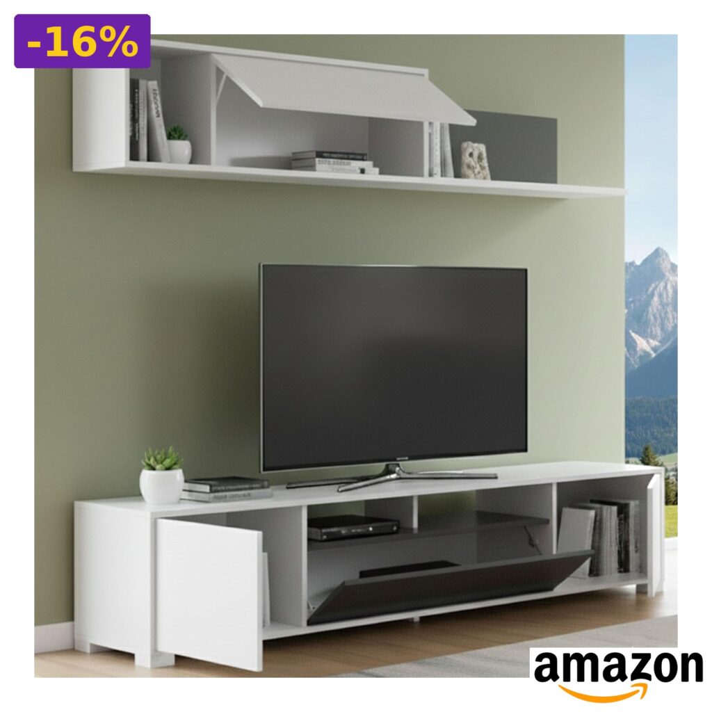 💎 Mobile tv moderno e funzionale per salotto, con ante a ribalta e battenti, vani interni e ripiani;